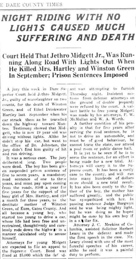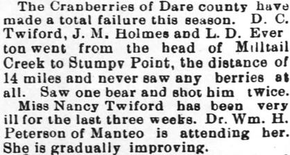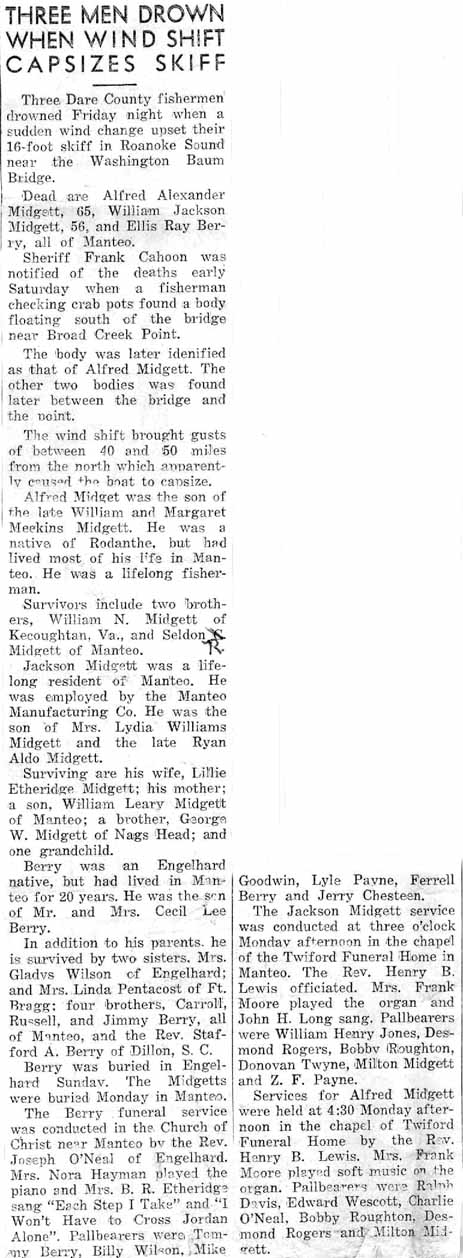 DIED AT MANTEO - Mrs. Elisha Twine [Alvania F. Midgett Twine] died at her home near Manteo Monday [March 2]. She had been a sufferer for some months and the end was not unexpected. Mr. Twine loses a noble and faithful wife. Two or three children are without a fond mother and the community will miss the good woman.The Tar Heel (Elizabeth City) - April 24, 1903; pg. 2 & 8
