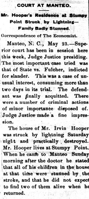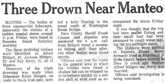 On the 22nd March John E. Berry & P.M. Foster of Roanoke Island and Hatteras, were turned over in Pamlico Sound near the Pamlico Fishery and came near being drowned. The boat was loaded with fish and sunk. The wind was blowing very hard and they would have drowned but for the timely arrival of a boat from the ice house which came to their rescue. Two days after, C.B. Blivens and Bailey Daniel of Roanoke Island were turned over in the same spot.The Economist (Elizabeth City, NC) Tuesday, May 7, 1878; pg. 2; col. 3