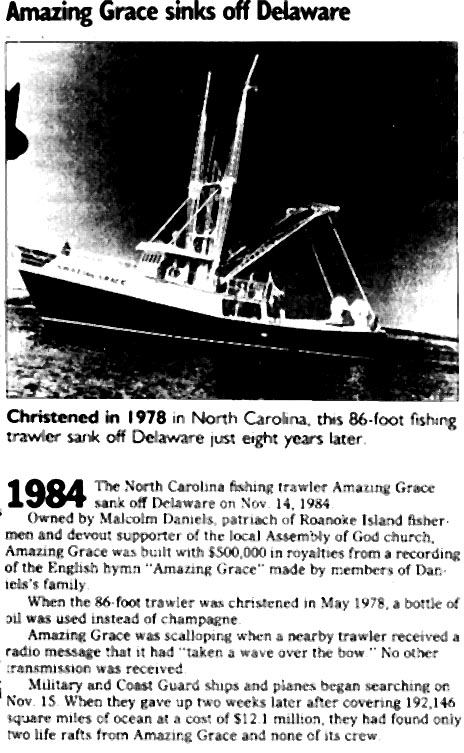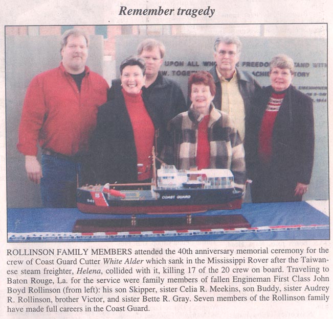 [Excerpts of a very lengthy article] A Dare County son was aboard the US Coat Guard Cutter White Alder when it went down in the Mississippi River 40 years ago, December 7, 1968. Only four of the 21 ship's crew survived--one was on shore leave and the other three were pulled from the river--17 went down with the ship, of which two were recovered; 15 are still entombed in the sunken cutter. Engineman First Class John B. Rollinson was on of the crewmen honored during the 40th anniversary memorial ceremony, held at the USS Kidd Veterans Museum in Baton Rouge, La., December 6. Several members of Rollinson's family were in attendance: his sons, Skipper of Farmington, N.M. and Buddy of Las Vegas, Nev.; his sisters: Celia R. Meekins of Manteo, Audrey R. Rollinson of Buxton, and Bette R. Gray of Waves; and brother, Victor of Wanchese. Constructed entirely of steel, the White Alder was a former Navy tender. It was commissioned as a USCG cutter in 1947 and was homeported in New Orleans. Its main mission was aids to navigation (bouy tending). On that fateful evening in 1968, the White Alder collided with Steam Ship Helena, a 455-foot Taiwanese freighter in the Mississippi River near White Castle, La. The cutter sank almost immediately in 75 feet of water. It remains there today. In 1969, the USCG dedicated a memorial in honor of the White Alder. In 2002 it was moved to Coast Guard Sector New Orleans in Bucktown, La. and rededicated. It has since served as a place to meditate and gain strength from the courage of those who have gone before. A flagpole flying a Coast Guard insignia has been erected on the river bank at the wreck site near White Castle. The survivors were Chief Boatswain's Mate Richard F. Batista (on shore leave), Seaman Apprentice Lawrence E. Miller, Boatswain's Mate Second Class Richard Kraus, and Fireman Bruce L. Kopowski. An interview with Miller relayed that at 6:30 p.m. that evening 40 years ago, the ship had just completed its mission of collecting 21 low-water bouys from the Mississippi. He was in the galley washing dishes when he heard the four blasts from the ship's whistle. Miller said "As soon as that happened, everybody jumps up in the eating area, and one of the sailors came running back and said 'Get off the ship!'" That sailor was John Rollinson. Miller made it out, Rollinson did not. Crewmen lost were Engineman First Class John B. Rollinson, Chief Warrant Officer Samuel C. Brown, Jr. (commanding officer), Chief Engineman William J. Vitt, Commissaryman Second Class Charles R. Morrison, Electrician's Mate Second Class Michael R. Agnew, Quartermaster Second Class John R. Cooper, Jr., Yeoman Second Class Joseph A.R. Morin, Boatswain's Mate Third Class Guy T. Wood, Engineman Third Class Walton E. O'Quinn, Jr., Seaman Frank P. Campisano, III, Seaman Richard W. Duncan, Seaman Roger R. Jacks, Seaman Steven D. Lundquist, Fireman Maurice Cason, Seaman Apprentice Walter P. Abbott, III, Seaman Apprentice Larry V. Fregia, and Seaman Apprentice Ramon J. Guitierrez. The program for the 40th memorial ceremony included a poem written by Pat W. Rollinson and dedicated to the White Alder in loving memory of her son, John Boyd, and his shipmates.