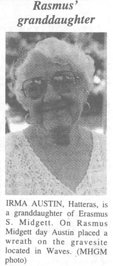 Prominently displayed on the station's grounds was a newly developed 1676-1999 genealogy of Rasmus Midgett. Inside the 1911 station hung an on-loan photograph of Rasmus and his spouse, Matilda Ann. Under a yellow and white canopy, storytellers Dick Darcey and John Gillikin told the amazing story of Rasmus Midgett.