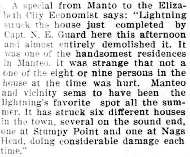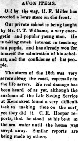 Although we live down here on the rugged coast and have to contend with the storms and fight the raging billows, we often think of you sitting quietly in your sanctum playing with your fingers for "Berry's" amusement or edification. Today while the elements were combined in furious rage, Captain Thomas P. Midyett, Keeper of U.S. Life Saving Station #19, led to the altar of matrimony, Miss Sarah H. Midyett, the beautiful daughter of Ebenezer Midyett, Esq. of this place. The ceremony was performed at the Life Saving Station by Israel B. Midyett, Esq. at 3 o'clock p.m. and witnessed by a large number of spectators. As the party were returning home from the Station a horse became unmanageable and threw Mrs. Mary S. Midyett, mother of the bride, to the ground and stepped on her head inflicting very severe injuries, but not so bad as feared. She was carried to her home and at last account was gradually improving. The bride and groom are at the Station where they will remain until Spring. [signed No. 3]The Elyria Democrat [Elyria, OH] November 10, 1887; pg. 2