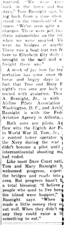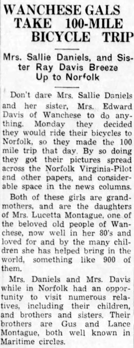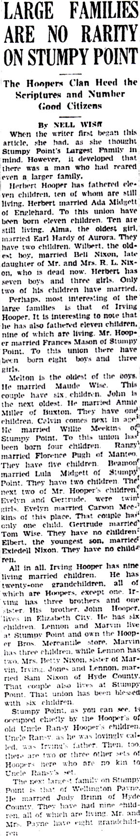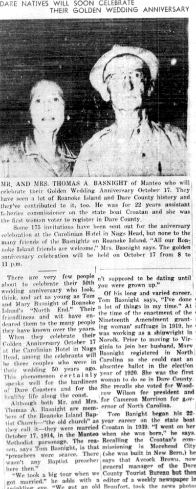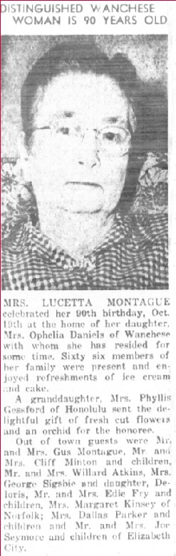 Mrs. Delora Fulcher celebrated her 82nd birthday on March 28, with seven of her children and grandchildren present, son, Earl Fulcher of Portsmouth, Va., Mr. & Mrs. Bill Pelegrim and sons of Winston-Salem, Mrs. Jennie Sharp of Chesapeake, Va., Mrs. Linda Whidbee and family, Mrs. Ina Burrus, Mrs. Nina Good and family, Mrs. Hilda Rollinson and family, all of Frisco. Others attending were Mr. & Mrs. Perry Austin, Mrs. Crawford Austin and Son, Mrs. Blanche Burrus, Dexter Willis and Red Rollinson. Refreshments were served and everyone had an enjoyable evening.The Coastland Times (Manteo, NC) October 12, 1964; pgs. 1 & 6