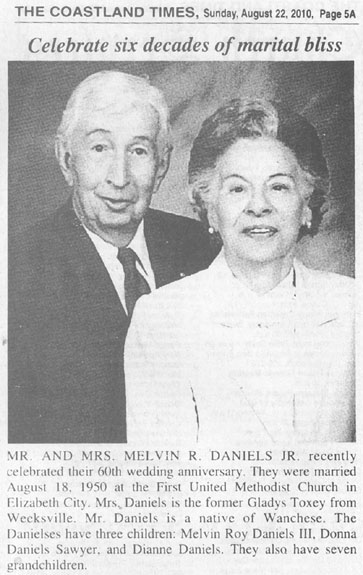 The death of Mr. Etheridge Daniels has left a large family and friends to mourn his loss.The Economist (Elizabeth City, NC) Tuesday, August 20, 1878; pg. 3; col. 4