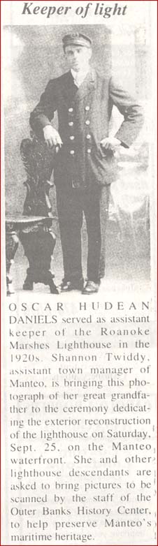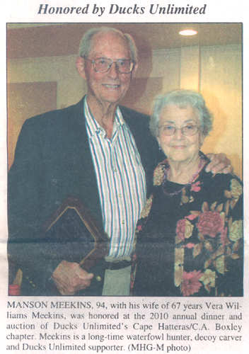 GUARDSMAN TRAVELS WORLD; RETURNS TO HATTERAS HOME - Manson Meekins, retired Coast Guardsman, waterman, storyteller, and artist, celebrated his 93rd birthday,Wednesday, February 18. Mrrlins' Coast Guard career spanned 37 years. He enlisted in Strathmere, N.J. in 1935 and carried on his family's traditional career. Meekins' father, grandfather and great-grandfather all served in the U.S. Coast Guard or U.S. Life-saving Service. In his Coast Guard careet, Meekins was not tethered to one base or life-saving station. During World War II, he was the revolver instructor for secret service officers in Washington, D.C. He trained merchant marines and served on a training shop homeported in St. Petersburg. Fla. He delivered water to Key West where contractors were building a defense installation. In 1943, on a short leave, Meekins returned to Avon and swooped up Vera Williams. After a train ride to Tampa, Fla., the couple stood before a judge to take their wedding vows. Meekins attended the U.S. Coast Guard academy for Officer Candidate School and was commissioned as an ensign. He was assigned to an attack transport, the Samuel Chase, with homeport in San Francisco. Sailing from the Philippines, Meekins helped deliver occupation forces to Japan and China. He returned to the United States to New York City, but went right back to the Pacific Ocean, this time to Honolulu, where he served as senior investigation officer for merchant marine affairs and then legal officer. Meekins returned to New York City as merchant marine inspection officer. He held positions as senior investigating officer of marine safety in Norfolk, Va. and Detroit, Mich. In Portsmouth, Meekins was the marine safety officer and senior inspector for personnel, the assignment from which he retired. In 1979, the couple moved back to Avon from Virginia. The lived for a year in the "old homestead" while a new home was under construction. Meekins still fishes only now he has someone go with him to "do the hard pulling." He maintains three duck blinds on the Kinnakeet reef. He is a storyteller. He'll hold forth at an upcoming event with the Land of Beginnings Festival. On Saturday, March 28 at 7 p.m. Meekins, Carol White Dillon and Zenovah Hooper will tell tales at the Hatteras Village Civic Center. Meekins is an accomplished artist too. His drawings are featured in the Ethnohistorical Description of the Eight Villages Adjoining the Cape Hatteras National Seashore, published by the National Park Service. One of his drawings is also displayed in the updated Corridor Management Plan for the Outer Banks Scenic Byway. Daughter Kathy was born in Honolulu and now lives in Great Bridge, Va. Daughter Kristin was born in Norfolk and now lives in Virginia Beach. Son Leslie, who died a couple of years ago, was the fifth generation of Meekins to serve in the U.S. Coast Guard.
