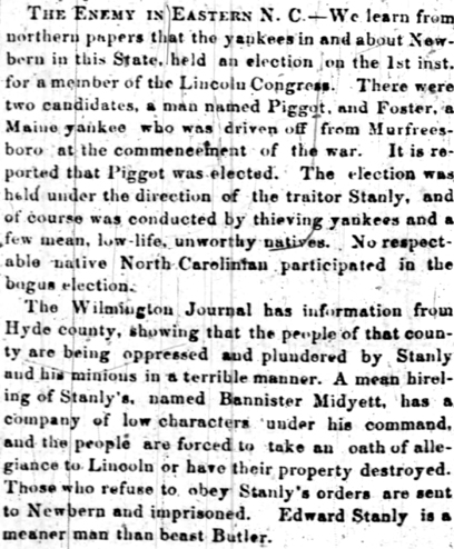 At the close of the war, R.W. Midyett, who was a corporal in the Union Army, was in a regiment at the time stationed near Newberne; when the regiment was disbanded and the arms given up, he marked the initials of his name on the breech of the musket, saying at the time, that it would come back some day. Recently he was coming up to E. City in a vessel when a flock of wild ducks flew over. A gun was handed out to Mr. Midyett to shoot the ducks. After shooting he saw his initials on the breech of the gun and recognized it as the gun he had marked. It had been bought from a junk store in Philadelphia by Capt. John C. Simpson.