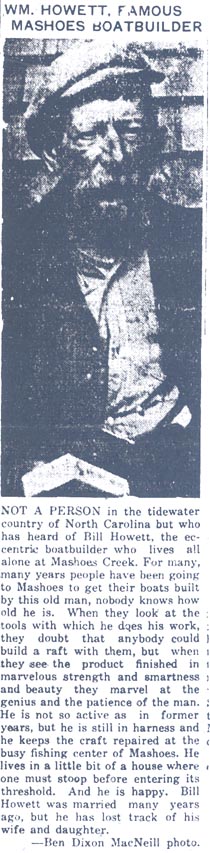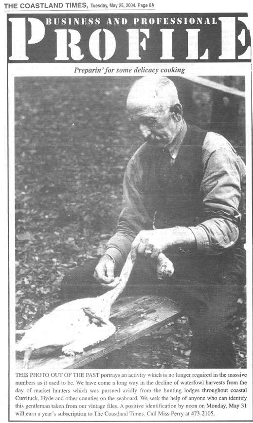 This photograph was identified the next week by Ivadean Wilson Priest, a Roanoke Island Native, who called to say that "Uncle Jeff" Hayman was the gentleman dressing the goose. Mr. Hayman is remembered for many walks of life, but probably most outstanding was his tenure at Fort Raleigh, operating as a vendor under the auspices of the National Park Service. Mrs. Priest won a year's paid subscription to the Coastland Times for her identification. [Submitted by Mary Hayman Kemp who received the original newspaper article from Shirley Jeanette Ambrose.]