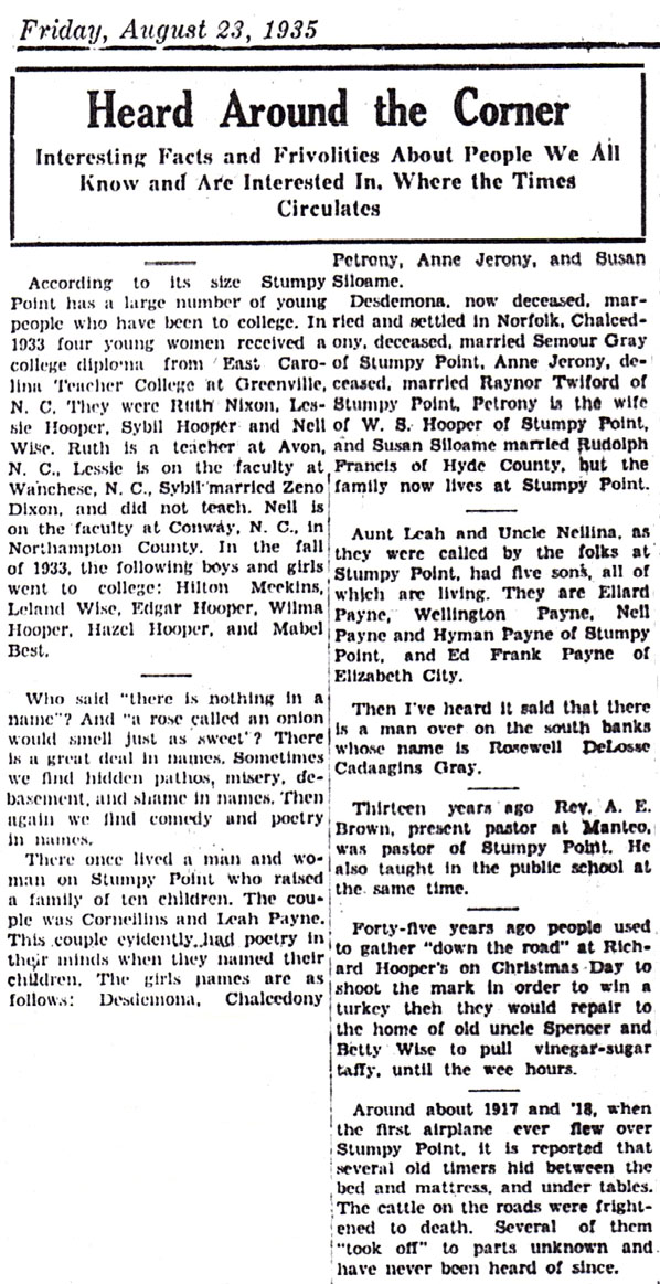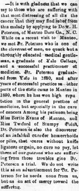 MANTEO - Cornelius Payne of Stumpy Point went last Friday to Salisbury, Maryland to be treated for cancer where he is to remain 3 or 4 weeks. He was accompanied by his brother-in-law, S.R. Hazen of Elizabeth City who returned Monday.The Weekly Economist September 23, 1898 (Submitted by Linda Lau)