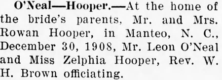 On the first day of January 1910, Mr. and Mrs. John O'Neal lost their daughter Mary Holland. Funeral and interment was conducted at Collington by J.J. Williams. The child was just a year old, having been born on the 1st day of January 1909.The Tar Heel (Elizabeth City) - Friday, January 14, 1910