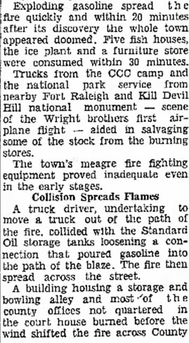 A kerosene lamp exploded in the home of Misses Bessie & Lessie Wescott in Manteo and their clothes became saturated with oil which quickly ignited. Miss Lessie Wescott is so badly burned that she is not expected to live. They were removed to the home of a friend where medical aid was rendered. The young ladies are 18 and 16 years old and are the daughters of the late Captain Joe Wescott who died suddenly last fall while enroute to his home from the life saving station at new inlet. They have lived in their home in Manteo since the death of their father.Later--Manteo, Jan. 11--Miss Lessie Wescott was burned to death here yesterday. She was alone at the time of the accident. A lamp fell on a red hot stove in the sitting room. the stove and part of the floor was covered with burning oil which she tried to put out with her dress. Her cries brought her older sister, Miss Bessie, who was in another part of the house. She was taken to the home of D.W. Etheridge but despite the physician's best efforts she died about 12 o'clock last night. The deceased was a beautiful young lady, about 17 years of age and was engaged to be married. The funeral services will take place at the Baptist church tomorrow at 10 o'clock. The Rev. D.A. Tedder, the pastor, will be assisted by Rev. A.W. Price of the Manteo Methodist Church and by Rev. W.R. Haight of Elizabeth City.