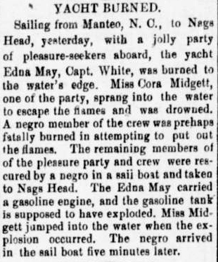 Schooner Capsized - NORFOLK, Va., Nov. 6.A distressing accident, by which twelve or more persons lost their lives, happened in Pasquotank Sound, N. C., Thursday night. The schooner Ocean Bird, Captain Daniels [listed as Edward C. Daniels in another newspaper], with passengers from Nag's Head and Manteo, N. C., left the latter port for Elizabeth City, Thursday. The vessel failed to reach her destination, and searching parties were organized, one of which found an up-turned boat of the schooner adrift in the Sound. From the condition of the boat it is thought that the schooner was capsized by a squall, immediately sank, and that all on board perished. Besides Captain Daniels and the crew, there are known to have been on the vessel, as passengers, E. C. Howe, a school-teacher, of Elizabeth City; H.A. Hendricks, a painter, of Nag's Head; Walter Midgett, a colored man of Kitty Hawk, and a son of Captain Daniels who was a United States mail contractor and in charge of the Ocean Bird . Relief parties are out searching for the missing vessel and any survivors.The Perquimans Record (Hertford, NC) May 27, 1891 (Submitted by Linda Lau)