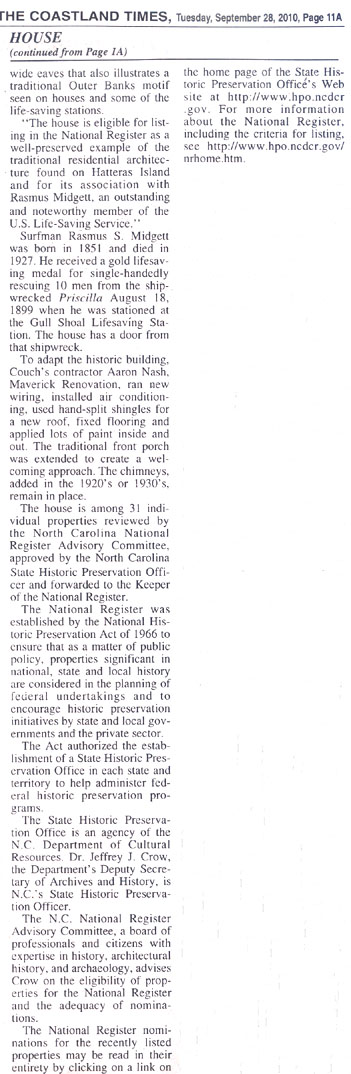 The Coastland Times (Manteo, NC) Tuesday, September 28, 2010; pg. 1A & 11A