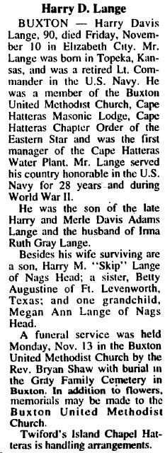 BUXTON - Harry Davis Lange, 90, died Friday, November 10 in Elizabeth City. Mr. Lange was born in Topeka, Kansas and was a retired Lt. Commander in the U.S. Navy. He was a member of the Buxton United Methodist Church, Cape Hatteras Masonic Lodge, Cape Hatteras Chapter Order of the Eastern Star and was the first manager of the Cape Hatteras Water Plant. Mr. Lange served his country honorably in the U.S. Navy for 28 years and during World War II. He was the son of the late Harry and Merle Davis Adams Lange and the husband of Irma Ruth Gray Lange. Besides his wife, surviving are a son, Harry M. "Skip" Lange of Nags Head; a sister, Betty Augustine of Ft. Levenworth, Texas; and one grandchild, Megan Ann Lange of Nags Head. A funeral service was held Monday, Nov. 13 in the Buxton United Methodist Church by the Rev. Bryan Shaw with burial in the Gray Family Cemetery in Buxton. Twiford's Island Chapel, Hatteras, is handling arrangements. (The Coastland Times - Tuesday, November 14, 2000; pg. 7A)
