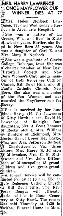 RALEIGH, NC - David Howe Lawrence, 84, died September 8, 2003 in Rex Hospital, Raleigh, NC. The son of Harry C. Lawrence and Helen Norbeck Lawrence, he was a longtime resident of the Outer Banks. An Engineer and surveyor, he was also engaged actively in real estate and construction, and was one of the original owners of Sea Scape Golf Course in Kitty Hawk. Following retirement, he worked with the Dare County Department of Parks and Recreation. He attended public schools in Manteo and New Bern, NC. After two years at Belmont Abby College he enlisted in the U.S. Army Air Force for service during WWII, and following the war earned his engineering degrees from NC State College. Mr. Lawrence is survived by two daughters, Barbara L. Wells of Oxford, MD and husband, Ken Wells; and Susan R. Lawrence of Chapel Hill; a step daughter, Julia M. Daniels of Chapel Hill; one sister, Joan “Joie” Bullock of Corapeake, and husband, Jeff Bullock, Sr.; his former wife, Martha Akin Lawrence of Chapel Hill; six grandchildren, four great grandchildren, and many loving nieces, nephews, grand nieces and grand nephews. A graveside service will be conducted by Rev. Joseph Klaus at 11:00 am, on Saturday, September 13th in the Baum Cemetery, Elijah Baum Road, Kitty Hawk. Funeral arrangements are by Twiford Funeral Home, Manteo. (The Coastland Times [Manteo, NC] - Thursday, September 11, 2003; pg. 10A)