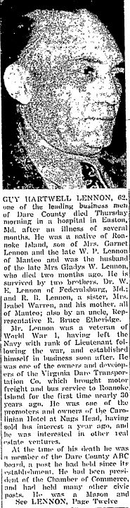 LESLIE LOWE DIES THURSDAY MORNING - Leslie Lowe, 30, died early Thursday morning at his home in Manteo following an illness of 10 months. Funeral services were held at the home Friday afternoon by Rev. M.W. Maness of Manteo and Rev. Lawrence of Wanchese. Burial was in Manteo Cemetery. Mr. Lowe was a native of Gates County and had lived in Manteo for about eight years. He is survived by his wife, the former Miss Elma Midgett of Manteo; one daughter, Annie Christian Lowe; his mother, Mrs, Estelle Lowe of Eure; two brothers: Vanna Lowe of Suffolk, Va. and Aubrey Lowe of Eure; one sister, Mrs. Elliott Cornette of Harrelsville; his grandmother, Mrs. Claudia Casper of Eure; and several uncles and aunts. (Dare County Times [Manteo, NC] - Friday, January 22, 1943; pg. 1)