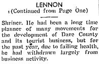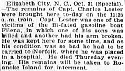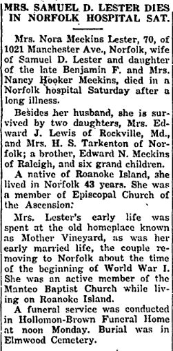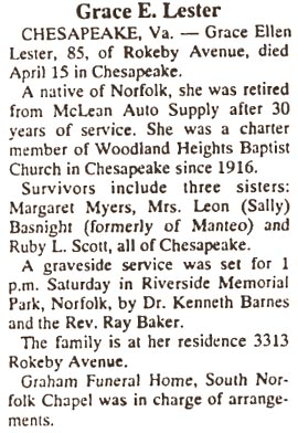 Charles Ross Lester, 84, of Norfolk, Va., died Thursday [Feb. 23, 1964] in a hospital. A native of Manteo, he was a son of Charles R. and Mrs. Matilda Wescott Lester and the husband of Margaret Anne Bright Lester. He was a charter member and deacon emeritus of Campostella Heights Baptist Church. Besides his wife, he is survived by 5 daughters: Mrs. W.T. Myers, Mrs. L.B. Basnight, Mrs. W.B. Scott, Miss Grace Lester and Miss Ruth Lester; two brothers: S.D. Lester and T.S. Lester; 3 grandchildren & 10 g-grandchildren, all of Norfolk, Va. A funeral service was held in Graham Funeral Home by The Rev. Paul D. Moore. Burial was in Riverside Memorial Park. (The Virginian-Pilot [Norfolk, VA] - Tuesday, February 28, 1964)