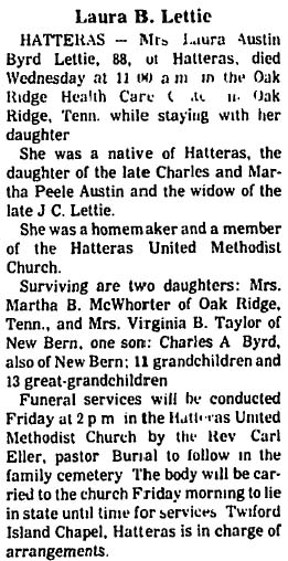YOUNGSVILLE - Dorcas Willis Austin Long, 86, died Sunday morning [Dec. 27, 1998] in Myrtle Beach, S.C. She was a native of Hatteras, a former resident of Poplar branch and Elizabeth City. Mrs. Long was the daughter of the late David Ellis and Minerva Gaskins Willis and the widow of Zack Austin and John Long. She was a member of the Frisco Assembly of God Church. She is survived by one daughter, Joyce Haste of Virginia Beach, Va.; one sister, Pearl Lewis of Marshallberg; 3 grandchildren and 7 great-grandchildren. Funeral services will be conducted today (Tuesday) at 3 p.m. in the Twiford's Memorial Chapel, Church Street, Elizabeth City, by the Rev. F. Joe Griffith. Burial will be in the New Hollywood Cemetery. Twiford's Memorial Chapel is in charge of funeral arrangements. (The Coastland Times [Manteo, NC] - Tuesday, Dec. 29, 1998; pg. 5A)