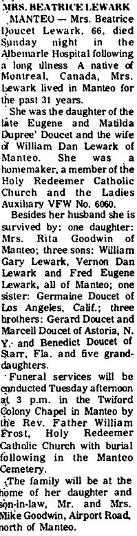 MANTEO - William Dan Lewark, 78, of Manteo, died January 7 in an Elizabeth City hospital. Mr. Lewark, a native of Corolla, was the son of the late William Van and Maria Midgett Lewark and the widower of Beatrice Doucet Lewark. He was a Merchant Seaman and a veteran of WW II, having served in the U.S. Coast Guard. He was a member of BPOE #856 and Veterans of Foreign Wars. Mr. Lewark is survived by two daughters: Rita Pledger of Manteo and Danielle Murphy Colgan of West Palm Beach, Fl.; three sons: William Gary Lewark of Engelhard, Vernon Lewark and Fred Lewark, both of Myrtle Beach, S.C.; twelve grandchildren and one great-grandchild. Funeral services will be held at Twiford's Colony Chapel on Jan. 10 by the Rev. Phillip Quidley. Burial will follow in The Manteo Cemetery. (The Coastland Times [Manteo, NC] - January 10, 1993)