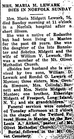 MRS. RENA CLARK LEWARK, 86, FRISCO NATIVE, DIES - Mrs. Rena W. Clark Lewark, 86, of 124 Myrtle St., Broadmoor, Norfolk, died Friday at the residence after an illness of 14 months. She was a native of Frisco, Dare County, N.C. and had lived in the Norfolk area the last 35 years. She was a daughter of Benjamin and Mrs. Charlotte Johnson Clark and the wife of the late Fred A. Lewark. Surviving are three sons: William H. Farrow and Ernest D. Lewark, both of Portsmouth, and John A. Lewark of Norfolk; one daughter, Mrs. W.F. Dickinson of South Norfolk; 9 grandchildren, 14 great-grandchildren and 3 great-great-grandchildren. Funeral services were conducted Sunday and burial was in Riverside Memorial Park, Norfolk. (The Coastland Times [Manteo, NC] - Friday, Sept. 12, 1958; pg. 8)