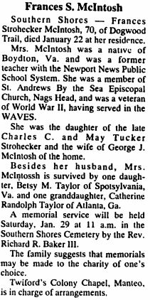 MANTEO - June Rittenhouse McClure died of a heart attack on October 11, 2008, at Duke Hospital in Durham after successful lung cancer surgery.  She was born in Philadelphia, PA on June 20, 1930 and grew up in West Chester, PA. She attended Pembroke College for one year and then joined the U.S. Navy. Her favorite job in the Navy was teaching sailing. She met her husband, Melvin “Mac” M. McClure at Naval Station Great Lakes and they married in Chicago in 1954. After leaving the Navy, she spent the next several years as a Navy spouse, living in California, Hawaii, Florida, Maryland, and Virginia. She and Mac lived for 30 years in Arlington, VA, where he retired from the Navy and started a new career, while June started a career in computer programming. Subsequently, in 2005, they moved to Manteo.  June attended six colleges in her lifetime and was particularly proud of her attendance at the Sorbonne in Paris, France. She loved learning, was a voracious reader and displayed an inquisitive mind throughout her life. After she developed macular degeneration, she enjoyed the delights of literature through the Talking Books program. She was a visitor to the Outer Banks 30 years ago and was thrilled when her daughter moved to Manteo in 2000. She visited often and moved here with Mac because of her love for Manteo and the Outer Banks.  She is preceded in death by her husband, Mac McClure who died in 2005; her mother, Sarah Neel Ellis in 2002; her father, Alfred Taylor Rittenhouse in 1937; and her sister, Elizabeth Anne “Boo” Bailey in 1991.  She is survived by her daughter, Pamela McClure and granddaughter, Katia Taylor McClure of Manteo and Apex, NC; her brother, P. Neel Rittenhouse and her sisters, Sally Rittenhouse Parry and Antonia Rittenhouse Wilson, all of Pennsylvania. The service will be held at Mt. Olivet United Methodist Church, on the corner of Essex and Ananias Dare Streets, in Manteo, NC on Saturday, October 25, 2008 at 2:00 pm. The burial will follow at Manteo Cemetery and a reception will be held following the service.  Twiford Colony Chapel, Manteo is assisting the family with arrangements.  (The Coastland Times [Manteo, NC] - Tuesday, October 21, 2008; pg. 10A)