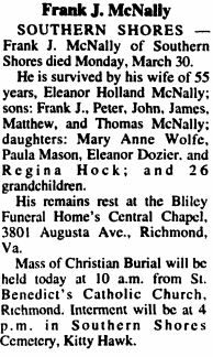 KILL DEVIL HILLS - Francis X. McArdle, 85, died of heart failure on February 17, 2009 in his North Carolina home. Mr. McArdle was born on August 22, 1923 in Brooklyn, N.Y. to James and Lillian McArdle. He served his country in the U.S. Army during World War II. Francis was employed with American Can Company as a financial analyst for 40 years.  He and his deceased wife Audrey retired in 1983 to their Outer Banks home. Known as “Bud”, he was married to Audrey for over 57 years. He was active in Holy Redeemer by the Sea Catholic Parish.   Surviving are his four sons: Kevin, Danny, Richard, Jamie and his seven grandchildren.   Friends may join the family for a viewing at Twiford Funeral Home on Sunday February 22, 2009, from 5:00 pm. to 8:00 p.m.   A funeral mass will be celebrated on Monday February 23, 2009 at 10:30 a.m. at Holy Redeemer by the Sea Catholic Church in Kitty Hawk by Father Edward Fitzpatrick. Following the mass, burial will be at Roanaoke Island Memorial Gardens in Manteo, NC. Audrey’s cremated remains will be laid to rest with Francis.  Twiford Funeral Home, Manteo is assisting the family with arrangements.  (The Coastland Times [Manteo, NC] – Sunday, February 22, 2009; pg. 10A)