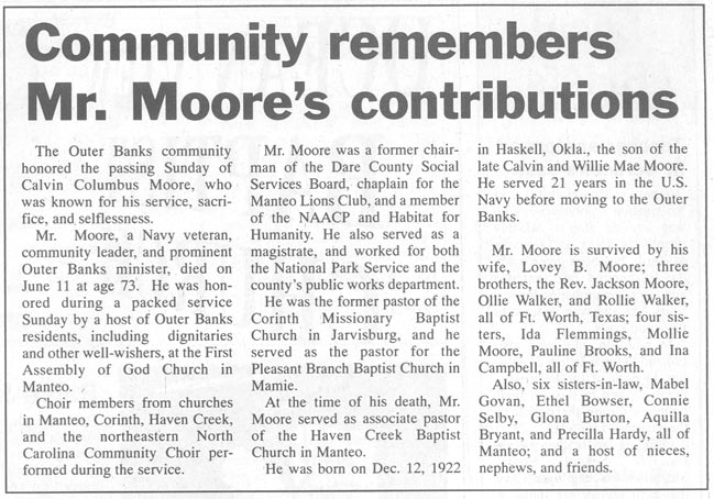 COLINGTON - Dallas Weightman Moore, Sr., 77, died Saturday, October 3, 1998 at his residence. Mr. Moore was a commercial fisherman and a member of Kingdom Hall of Jehovah's Witnesses of Grandy, N.C. He served in the U.S. Navy during World War II. Mr. Moore was the husband of May Humer Moore of Colington and the son of the late John Thomas and Chloe Beasley Moore, Sr. Besides his wife, surviving are four daughters: Donna Patchett of Crystal Beach, Florida, Marlene Costello of Palm Harbor, Florida, Judy Deaver and Terri Nunemaker, both of Colington; two sons: Dallas W. "Buster" Moore, Jr. and Frank Moore of Colington; two brothers: Orville Moore and Stanley Moore, both of Colington; 15 grandchildren and 13 great-grandchildren. A graveside service will be held at 11 a.m. Wednesday in the Hilltop Cemetery in Colington with Elder Clay Clark officiating. The family will receive friends at Twiford's Colony Chapel in Manteo, N.C. (The Virginian-Pilot [Norfolk, VA] - Tuesday, October, 6, 1998)