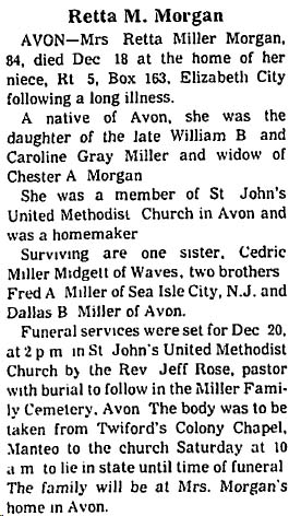 Mrs. Leona Lupton Morrow, 66, died October 5 in the Albemarle Hospital after an illness. Graveside services were held Thursday at 2 p.m. in the Manteo Cemetery with Twiford's Colony Chapel in charge. Mrs. Morrow was a native of Lowland, N.C., a former resident of Virginia Beach, Va. and had lived in Manteo for the past seven years. She was a former school bud driver in Virginia Beach. Daughter of Mrs. Melvina Simpson Lupton of Manteo and the late John C. Lupton, she was the wife of the late Johnny S. Morrow. Besides her mother, she is survived by two daughters: Mrs. Donna Jean Lupton of Manteo and Mrs. Joan Rhodes of Waterloo, Iowa; a sister, Mrs. Kathleen Bennett of Elizabeth City; two brothers: Colon Lupton of Manteo and [rest of obit is cut off]. (The Southern Post [Coinjock, NC] - Wednesday, October 13, 1982; pg. 8)