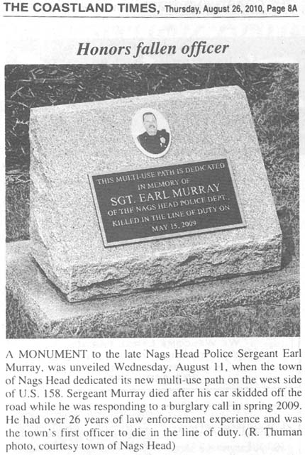 KITTY HAWK - Dulan Earl Murray, Jr., 48, of Kitty Hawk, died Friday May 15, 2009 in Nags Head. Mr. Murray was born in Kenansville, NC and was a Sergeant with the Nags Head Police Department. Mr. Murray had a law enforcement career that spanned over 27 years. He was a former member of police departments in Wallace, NC, Kill Devil Hills, NC and the Dare County Sheriffs Department. Earl was a wonderful father to his children. He was the son of Dulan Earl Murray, Sr. and wife, Billie of Wallace, NC and Virginia Lucas Williamson of Magnolia, NC; and the husband of Kim Parker Murray of the home. Besides his wife and parents, surviving are two daughters, Samantha Joy Murray and Paige Danielle Murray, and one son Brett Lee Antinori all of Kitty Hawk; one sister, Lynne Carr-Wiggins of Holden Beach, NC; and maternal grandmother, Aimie Johnson of Magnolia, NC. A service of remembrance will be Tuesday May 19, 2009 at 2:00 pm in Holy Redeemer by the Sea Catholic Church by Rev. Rick Lawrenson. Burial will follow in Hilltop Cemetery in Colington. Friends may join the family at Twiford’s Funeral Home on Monday from 5pm to 8pm. Twiford Funeral Home, Manteo is assisting the family with arrangements. (Twiford Funeral Home & The Coastland Times [Manteo, NC] - Sunday, May 17, 2009; pg. 8A)
