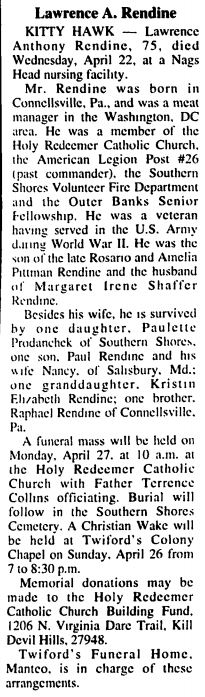 Ina Faye Clark Reid, 84, of Avon, died at Peak Resources Outer Banks in Nags Head on Jan. 8. She was the daughter of Hilton and Lula Powell Clark, born on May 16, 1934. Faye was born in Chincoteague, VA on May 16, 1934. She was a home keeper and an artist at heart, painting many scenes of the Eastern Shore and Chesapeake Bay. She is predeceased by her parents, four brothers and one sister. She is survived by her long-time companion, Cecil Stanley Williams, Jr. A private ceremony will be held at a later date with interment in the Clara Ann Williams Family Cemetery, North End Road, Avon. Twiford Funeral Home, Manteo is assisting the family with arrangements. (Outer Banks Sentinel - January 23, 2019)Lawrence Anthony Rendine