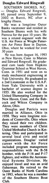 KILL DEVIL HILLS, NC - Benjamin Franklin Rider, 64, of 312 Sir Chandler Dr., Kill Devil Hills, NC, died Sunday, May 2, 2004 at his residence. He was born in Athelston, AR to the late Daniel Boone and Mary Marie Brewer Rider. He was a retired agent with C.I.A., a veteran of the U.S. Army, and a charter member of the BAD EMS Golf Association. Mr. Rider is survived by two daughters, Kathy Marie Bernard and ex husband Dave of Gaithersburg, MD and Debra Lynn Rider-Cadle and husband Greg of Waretown, NJ; one son, Benjamin Logan Rider and wife Jennifer of Gaithersburg, MD; three sisters, Louise Weiss of New York, Mettie Copes of Louisiana, and La Ruth Rider of Arkansas; five brothers, J.D. Rider of Texas, Doug Rider of Louisiana, Chuck Rider of Oklahoma, George Rider of Texas, and Jimmy Rider of Mississippi; five grandchildren, Matthew, Christopher, Justin, Alex, and Jordy; and his ex-wife, Susan Rider of Kill Devil Hills. A funeral service will be conducted on Wednesday, May 5, 2004 at 11:00 AM at Twiford’s Colony Chapel by the Rev. Douglas Rider. The family will receive friends at the funeral home one hour prior to the service on Wednesday. Twiford’s Colony Chapel, Manteo, NC is in charge of arrangements. (Twiford Funeral Home obituary)