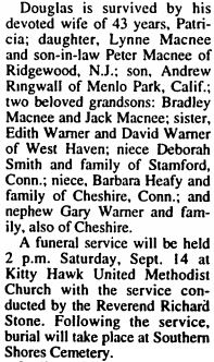 Nina Ramsayer, 86 of Lauderdale by the Sea, FL, died Friday, June 3, 2005 in a Ft. Lauderdate, FL. Mrs. Ramsayer, born in Rodanthe, NC, was a homemaker and a member of Fairhaven United Methodist Church. She was the daughter of the late George W. and Lurania Midgett and was also preceded in death by her first husband Cmdr. Warner M. Minor, USN, her late husband, Dr. Herbert Ramsayer, a daughter, Jillian Osborne, a sister, Wilma Midgett, and three brothers, Nathaniel Midgett, Walton Midgett and Earl Midgett. Mrs. Ramsayer is survived by three daughters, Myrna Peters and husband, Gene Kniseley of Rodanthe, NC, Dr. Warna M. Gillies and husband, Randy of McLean, VA and Christi Minor Rummel and husband, Eric of Lauderdale by the Sea, FL; a son Warner M. Minor, III and wife, Patty of Newport News, VA; a son-in-law, Bret Osborne of Virginia Beach, VA; a sister, Georgia Eason of Chesapeake, VA; five grandchildren, Bryce Gillies, Neal Gillies, Angela Minor, Sarah Minor and Logan Minor. Funeral services will be held at Fairhaven United Methodist Church, Rodanthe, NC on Saturday, June 11, 2005 at 10:00 AM with Rev. Susie Fitch-Slater officiating. Burial will follow in the Manteo Cemetery. The family will receive friends at the church on Friday evening from 7:00 to 9:00 PM. Twiford's Colony Chapel, Manteo is assisting the family with arrangements. (The Coastland Times [Manteo, NC] - Thursday, June 9, 2005; pg. 16A)