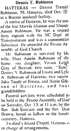 FRISCO - Dennett Eugene Ransom, 66, die Tuesday, September 14 at his residence. Mr. Ransom was born in Norfolk, Va. and was a retired teacher and principal of Cape Hatteras Union Schools. He was a member of the Hatteras United Methodist Church, past president of the Cape Hatteras Water Assc., former Boy Scout Master Troop #176 and served in the U.S. Air Force during the Korean conflict. He was the son of the late Dennett Henry and Ella Mae Rollinson Ransom. He is survived by his wife, Diane Burrus Ransom of the residence; one son, Dennett Adolphus Ransom, and one brother, Ellis Melvin Ransom, both of Frisco. A memorial service will be held at Hatteras United Methodist Church Sunday, Sept. 26 at 3 p.m. by the Rev. Jim Huskins. Twiford Island Chapel, Hatteras, is handling the arrangements. (The Coastland Times [Manteo, NC] - Sunday, September 19, 1999; pg. 12A)