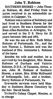 MANNS HARBOR - John Dominic Royals, Sr., 80, died Monday, July 3 [2000] at his Chesapeake, Va. residence. Mr. Royals was born in Newton Grove to the late Ira Clyde and Mary Ann Denning Royals. He was a veteran, having served in the Y.S. Air Force during WWII. Mr. Royal worked as a machinist in the Naval Shipyard, was a member of the American Legion, and a "Jack of all Trades" who loved working outdoors and building. He is survived by his wife of 54 years, Mollie Gallop Royals; one daughter, Mary Louise Lundholm and husband Gary of Chesapeake; one son, John Royals, Jr. and wife Pam of Chesapeake; seven grandchildren and five great-grandchildren. He was predeceased by a daughter, Julia Ann Royals Morgan. Funeral services will be held at 3 p.m. Friday at Twiford's Colony Chapel, Manteo, with the Rev. Derek P. Koolman officiating. Burial will be in Cudworth Cemetery, Wanchese. The family will receive friends at their Manns Harbor residence all day Thursday. Mr. Royals will be available for viewing in Manteo at Twiford's Colony Chapel after 12 noon on Thursday. Twiford's Colonial Chapel, Chesapeake, is in charge of arrangements. (The Coastland Times [Manteo, NC] - Thursday, July 6, 2000; pg. 4B) [Obituary kindly submitted by Vickie Craddock]