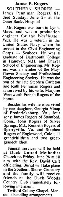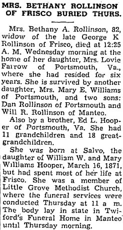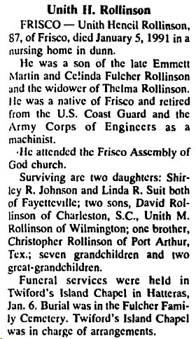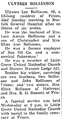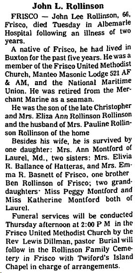 William Gibbons Rollinson, 85, who left Frisco 23 years ago following his retirement from the Lighthouse Service and made his home with his daughter at 213 Court St., Portsmouth, Va., died Friday [Feb. 13, 1959] at the home after a long illness. He was a native of Frisco, the son of the late Mr. and Mrs. Erasmus Rollinson, and his wife was the late Mrs. Marian Whedbee Rollinson. He is survived by two daughters: Mrs. Lessie Diaz and mrs. Alexander Walter, both of Portsmouth; one son, Lt. Cmdr. Hoyt W. Rollinson (USCG Ret.) of Baldwin, N.Y.; one brother, W.R. Rollinson of Buxton; one sister, Mrs. Annie Peele of Virginia Beach; 4 grandchildren and 4 great-grandchildren. Funeral services were conducted Monday at 2:30 p.m. and burial was in Greenlawn Memorial Park Cemetery, Portsmouth. (The Coastland Times [Manteo, NC] - Friday, February 20, 1959; pg. 8)