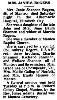 CARROLLTON, VA. - Ellen M. Toler Redford, 71, of Carrollton, died Wednesday, April 17, in Sentara Norfolk General Hospital. She was a native of Kitty Hawk, a homemaker and a Baptist. Survivors include one daughter, Marsha R. Bryan and son-in-law Johnny R. Bryan; three sons: Wayne Sinclair Redford of Floyd, Va., Bernard William Redford and Albert Carl Redford, both of Carrollton; one brother, Albert W. Toler of Forestdale, Mass; and two grandchildren. A graveside service was set for April 20 in Austin Cemetery in Kitty Hawk with the Rev. John Stauess, pastor of Corolla Chapel to officiate. (The Coastland Times [Manteo, NC] - Sunday, April 21, 1996; pg. 2B)