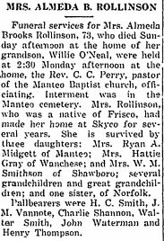 HATTERAS, N.C. - Mrs. Theresea Goodwin Rollinson, 81, a native of Cedar Island and resident of Hatteras for 56 years, died here Monday [Jan. 11, 1965] at 3:45 p.m. after an illness of 2 months. She was a daughter of Thomas and Mrs. Theresea Lupton Goodwin. Surviving are a sister, Mrs. Eula Goodwin of Cedar Island; a grandson, Leonard Philmore Gaskins. The body was taken to Twiford Funeral Home in Hatteras. A funeral service will be conducted today at 2:30 in Hatteras Methodist Church by the Rev. H.B. Harrell. Burial will be in Rollinson Cemetery in Hatteras. (unknown newspaper)