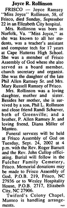 BUXTON - W. Michael Rollinson, 55, died Saturday, August 1, 2009. Born in Buxton, he was the son of the late Robert Crisp Rollinson, Jr. and Mildred Joyce Hehl Rollinson. Michael is survived by three sisters, Connie Rollinson, Caryn Montelione and husband, Greg, and Tamera Dodds and husband, Gene; two brothers, Kenneth Rollinson and wife, Shelby and Robert C. Rollinson and wife, Kim; two daughters, and several aunts, uncles, nephews, and cousins. A funeral service will be held on Friday, August 7, 2009 at 11:00 AM at Heritage of Faith Family Church, Frisco by the Rev. David Stowe. The family will receive friends and relatives in the fellowship hall of the church immediately following the service. In lieu of flowers, donations to help with funeral expenses may be made to Heritage of Faith Family Church, P.O. Box 297, Buxton, NC 27920. Twiford Funeral Homes, Island Chapel, Hatteras, NC is assisting the family with arrangements. (The Coastland Times [Manteo, NC] - Thursday, August 6, 2009; pg. 10A)