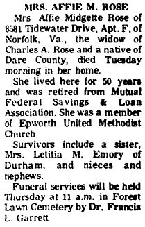BUXTON, N.C. - Mrs. Rosaria Danese Rosiello, 75, a native of Italy, died in Albemarle Hospital Friday [April 9, 1965] at 7:35 a.m. She lived in the United States seven years. She was a daughter of Benjamine and Mrs. Carmela Mormina Danese and a member of the Catholic Church. She is survived by her husband, Giovanni Rosiello of Buxton; three daughters: Mrs. Russell Oche and Mrs. Wanda Dunn of Buxton, and Mrs. Rosa Bigham of Naples, Italy; a son, Domenico Rosiello of Naples; and seven grandchildren. A funeral service will be held Monday at 11 a.m. in the Naval Facility Chapel at Cape Hatteras by Father Joseph Klaus of Edenton. Burial will be in Quidley Cemetery at Buxton. Twiford’s Funeral Home, Hatteras, is in charge of arrangements. (unknown newspaper)