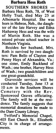 KITTY HAWK - Virginia Franklin Ross, 85, died on December 12 at Britthaven of the Outer Banks. Born in Madison, Va., she was a librarian, serving many years in Fairfax County, Va. before moving to Southern Shores in 1977. A long-time environmentalist, Mrs. Ross was a past president of the Dunes of Dare Garden Club, and was instrumental in the preservation of Nags Head Woods. She participated in the identification of some 100 species of wild flowers that led to the publication of the book "Wildflowers of the Outer Banks" under the auspices of the University of North Carolina Press. She also compiled a great deal of information about the early settlers of the Outer Banks that has been given to the North Carolina History Center in Manteo. Mrs. Ross was a charter member of the Unitarian Universalist Congregation of the Outer Banks, the Southern Shores Citizens Association and the Duck Woods County Club. She was preceded in death by her husband, William Haig Ross, and a son, William Howell Ross. She is survived by a daughter, Melanie Anne Phelps of Massarykton, Fla.; a son, Robert Howell Ross of Manns Harbor; and a brother, Howell C. Franklin of Montross, Va.; seven grandchildren and a number of great-grandchildren. The family will receive friends at Twiford Colony Chapel, Manteo on Wednesday, Dec. 15, from 7-8:30. There will be a graveside service in the Baum Cemetery, Kitty Hawk, on Thursday, Dec. 16 at 2 p.m. officiated by the Rev. Anne Buchler. Twiford Colony Chapel, Manteo is handling arrangements. (The Coastland Times [Manteo, NC] - Tuesday, December 14, 1999; pg. 9A)