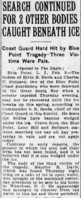Capt. Herman Cornelius Smith, 71, retired Coast Guard Warrant Officer and beloved citizen of Manteo, died Friday morning [Oct. 12, 1951] at the family residence in Manteo following an illness of two days. Funeral services were conducted Sunday afternoon in the Manteo Methodist Church. Rev. D.W. Willis, pastor of the church, officiated, assisted by Rev. H.V. Napier, pastor of the Manteo Baptist Church. The church choir sang "The Lord's My Shepherd" and "Jesus, Saviour Pilot Me". The casket was draped with the American flag. Masonic rites were conducted at the graveside in the Manteo Cemetery by Lodge #521 of which Capt. Smith was a member. Military rites were also conducted at the graveside. "Captain" Smith, as he was known to his friends, served in the Coast Guard for 30 years and retired with the rank of Chief Warrant Officer while in command of Core Banks Station. He was for many years in command of Bodie Island Station. He was presented with a gold watch by the King of Sweden following his courageous action at the time of the wreck of the Carl Gerhardt off the North Carolina Coast in 1922. He was a member of Mount Olivet Methodist Church in Manteo, the Masonic Lodge #521 of Wanchese, and the Wanchese Order of the Eastern Star. He was a member of the Dare County Draft Board and for a number of years served on the Manteo School Board. He was a native of Currituck County but had been living in Manteo for the past 30 years. He was the son of the late Lovie Cowell and Cornelius Smith and the husband of Mrs. Polly O'Neal Smith. Besides, his wife, he is survived by two daughters: Mrs. Nick Sapone of Manteo and Mrs. J.L. Newman of Nags Head; three sons: Walter Smith of Avon, Marshall Smith of Norfolk and Herman Smith, Jr. of Manteo; two sisters: Mrs. Mary Crawley of Miami, Fla. and Mrs. Trix Savage of Norfolk; one brother, Ivey Smith of Philadelphia, Pa.; 14 grandchildren and two great-grandchildren. [A small photo of Capt. Smith accompanied this article] (The Coastland Times [Manteo, NC] - Friday, October 19, 1951; pg. 1)