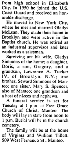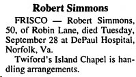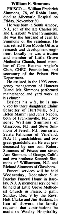 FRISCO - Alva Arnold Simmons, Sr., 70, of Frisco, died, Friday, June 4, in his residence. Mr. Simmons was born in Columbia, N.C. and was retired from the U.S. Coast Guard after 22 years of service and was self employed as a contractor. He was a member of Frying Pan Baptist Church in Columbia, VFW Post # 9280 in Edenton and was Chief Judge at the Dare County Board of Elections Polls in Frisco. Mr. Simmons was the son of the late Linwood and Lucy Spruill Simmons and the husband of Cora Austin Simmons. Besides his wife surviving are three sons; Anthony Simmons of Greenville, N.C., Kerry Simmons of Kill Devil Hills and Kevin Simmons of Hatteras, three sisters; Margie Weatherly of Rocky Hock, Iris Ambrose of Creswell and Linda VanMeter of Bridgeport, WV, five grandchildren; Wayne Simmons, Clay Simmons, Cory Simmons, Daniel Simmons and Jennifer Simmons. Mr. Simmons was pre-deceased by his son Arnold Simmons, Jr. and brother Glenn Simmons. A Celebration of Life will be held Monday, June 7, 2004, in Hatteras United Methodist Church at 2:00 p.m. by the Revs. Roger Barnett, Joseph Wynns and Charles Moseley. Burial will be in the Ballance Cemetery. Friends may join the family at Twiford’s Funeral Home, Sunday from 6:00 p.m. to 8:00 p.m. and other times at the residence 50323 Spencer’s Lane in Frisco. Twiford’s Island Chapel Hatteras is handling arrangements. (The Coastland Times [Manteo, NC] - Tuesday, June 8, 2004; pg. 14A)
