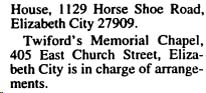 MANTEO - Florence Midgett Sikora, 77, of 209 John Borden St., Manteo, died Sunday morning at her residence following a long illness. She was a native of Manteo, the daughter of the late Jerry H. and Mrs. Mary Gray Midgett and the widow of Frank C. Sikora. Mrs. Sikora is survived by two daughters: Mrs. Jeanine Tillett and Mrs. Frances C. Colman, both of Manteo; one son, Albert Jerry Daniels of Manteo; one sister, Mrs. Lonie Wescott of Manteo; one brother, Elmer R. Midgett of Manteo; eight grandchildren; two great-grandchildren and one great-great-grandchild. Funeral services will be conducted Tuesday afternoon at 2 p.m. in Twiford's Colony Chapel, Manteo, by the Rev. Carroll Daniels. Burial will follow in the Manteo Cemetery. (The Coastland Times [Manteo, NC] - Tuesday, June 5, 1984)