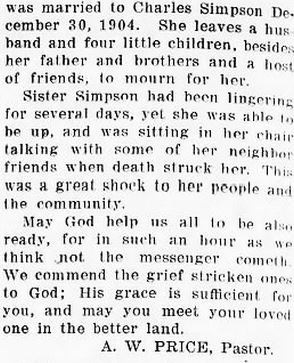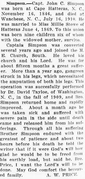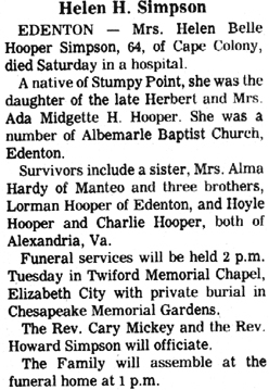 MRS. H.B. SIMPSON DIES IN NORFOLK - Mrs. Aldean Meekins Simpson, 63, wife of H.B. Simpson, died Tuesday, October 9, in a Norfolk hospital following a long illness. Mrs. Simpson was a native of Wanchese but had made her home in Norfolk for the past 29 years. She was a member of McKendree Methodist Church. Funeral services were conducted Thursday afternoon at 3:30 by Rev. F.H. Strieby, pastor of her church. Burial was in Forest Lawn Cemetery. Pallbearers were Harold A. Meekins, Roy C. Meekins, John S. Meekins, Casper D. Meekins, Jack S. Gaskill and Mack L. Gaskill. Besides her husband, Mrs. Simpson is survived by one daughter, Mrs. K.L. Stephenson of Norfolk; three sisters: Mrs. M.L. Gallop, Mrs. W.C. Gaskill, and Mrs. S.L. Tillett of Wanchese; four brothers: L.R. Meekins of Norfolk, C.S. Meekins of Manteo and J.G. Meekins and C.D. Meekins of Elizabeth City; and a number of nieces and nephews. (Dare County Times [Manteo, NC] - Friday, October 12, 1945; pg. 1)