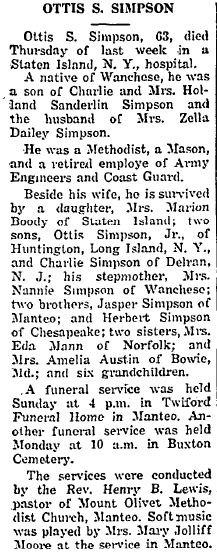Ottis Silverthorne Simpson, Jr., 47, died in the U.S. Public Health Hospital in Staten Island, New York June 3 [1975] after an illness of one month. A native of Buxton, he was the son of Mrs. Ottis Simpson (former Zella Dailey) and the late Ottis S. Simpson. He served as a staff sergeant in the U.S. Air Force in WWII, retiring around 1971. In addition to his mother, he is survived by one daughter, Miss Lynn Simpson of Boston, Mass.; one sister, Mrs. Marion Doody of Staten Island; and one brother, Charlie Simpson of St. Louis, Mo. Funeral services were held in Twiford's Colony Chapel, Manteo, Friday with burial following in the family cemetery, Buxton. The Rev. Henry A. Bizzell, pastor of Mt. Olivet Methodist Church, Manteo, officiated. (unknown newspaper - June 1975)