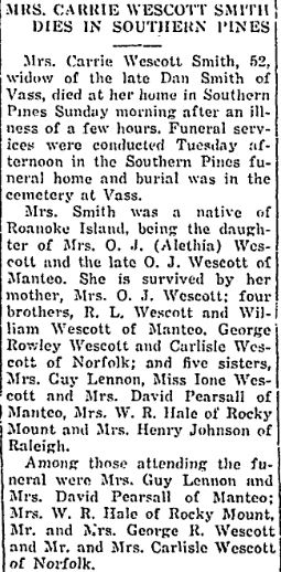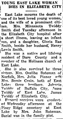 Mrs. Laura Smith Skinner, 31, of Manteo and Norfolk, died Wednesday morning in a Norfolk hospital after an illness of about two weeks. Mrs. Skinner, the daughter of Capt. and Mrs. Herman C. Smith of Manteo, has been living in Norfolk for several months, being employed there. She was the widow of the late Clarence Pinker Skinner of Minneapolis, Minn., and besides her parents is survived by three children: Clarence Skinner, Jr., Marguerite and Betty Alice Skinner; two sisters: Mrs. J.L. Newman of Manteo and Mrs. N.F. Sapone of Norfolk; three brothers: Herman Smith, Jr. of Manteo, Marshall Smith of the U.S. Army, and Walter Smith of the U.S. Navy; two nieces: Marceline and Patty Smith of Washington, D.C.; and three nephews: Stanley Newman and Marshall Smith, Jr. of Manteo, and Bill Smith of Avon. Funeral services will be conducted Friday afternoon at the home at two o'clock by Rev. M.W. Maness and Rev. W.C. Blue. Interment will be in the Manteo Cemetery. (Dare County Times [Manteo, NC] - Friday, May 21, 1943; pg. 1)