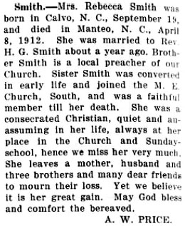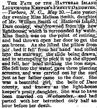 HATTERAS NOTES - Our community was greatly shocked this week to hear of the sudden death at Manteo of Mr. R.W. Smith. Mr. Smith was raised at Hatteras and moved to Manteo during his early manhood, where he became very prominent in business, social and political affairs. Mr. Smith was a man of the most exemplary character sterling qualities, and was a most desirable citizen in every term that the name implies. He was probably the most beloved and held in the highest esteem by the people of the Banks of nay man that ever lived in this section. He was generous to a fault, kind, loving and charitable, and many is the poor widow whose distress he has relieved and many the orphan who has found in him a friend and a father. The name of "Bob Smith" has been a household word on the Banks for many years and many is the one that will miss his pleasant call. All of his friends in this section tender to the afflicted family their sincere sympathy and feel with them the lasting grief of their bereavement. (The Tar Heel [Elizabeth City, NC] - Friday, April 9, 1909; pg. 1)