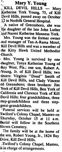 HATTERAS - Harvey Young, 76, died Jan. 5 at his residence following a long illness. A native of Spring Lake, N.J., he was the son of the late John Harvey and Mary Ann Hartramph Young and the husband of Rose Ballance Young of the home. He was a Methodist and a retired accountant. Besides his wife, surviving are three daughters: Wealthy Ann Colleti of Cairo, W. Va., Barbara Gray of Hatteras, and Wylie Williams of Villas, N.J.; eight grandchildren and two great-grandchildren. Memorial services were held Wednesday in the Hatteras United Methodist Church by the Rev. Carl Eller, pastor. Twiford's Island Chapel, Hatteras was in charge of arrangements. (The Coastland Times [Manteo, NC] - January 1987)
