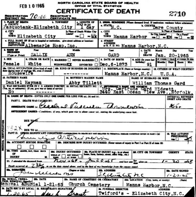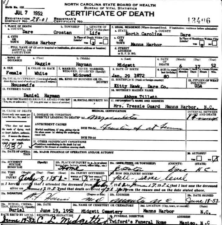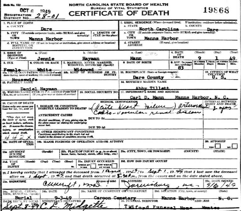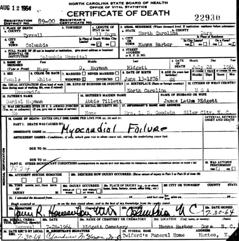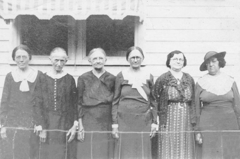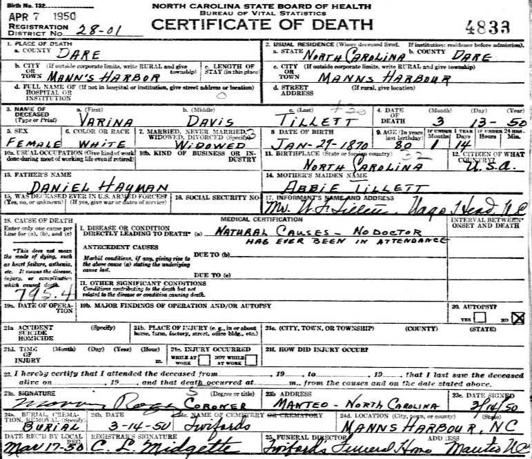 Left to Right - This same photograph and lengthy newspaper article about these sisters appeared in The Dare County Times on June 27, 1947. NOTE: The news article erroneously cited Elizabeth "Lizzie" Hayman Spencer as having died in 1939....her obituary and tombstone show 1943. See also the Daniel W. Hayman Bible.] |