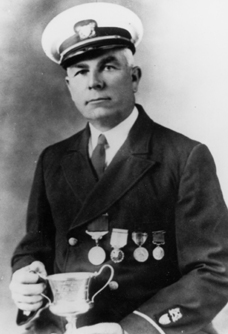 No man in the United States Coast Guard became more widely known than Midgett after his heroism one August afternoon in 1918. Chief Boastwain Midgett, while in charge of Chicamacomico Coast Guard Station, was in command of a lifeboat that went to the aid of the British tanker Mirlo, which had been torpedoed by a German submarine offshore from Midgett's station. The ship's cargo of gasoline and oil spread over ten miles of ocean, burning as it spread. The crew of the stricken tanker abandoned ship in three boats. One capsized as it was being lowered; another was so crowded as to be unmanageable. The daring crew of the Chicamacomico Coast Guard Station and its commanding officer pulled the survivors of the capsized boat from the blazing oil, located and took the other two boats in tow, and landed forty-two men safely ashore through a burning ocean of raging, stormy surf. Midgett's simple sentences, in their brevity, are best captured in his official report of the episode in the Coast Guard annals, This report give an unforgettable picture of a deed of daring that takes first rank in the saga of the U.S. Coast Guard Service.