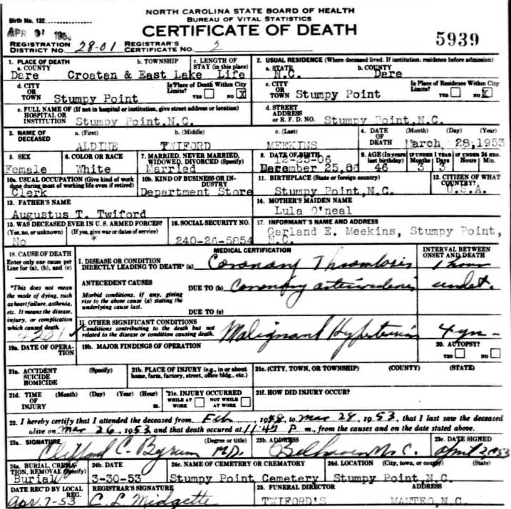 NC on Sept. 23, 1881 to Benjamin Franklin Twiford (1843-1922) and his 4th