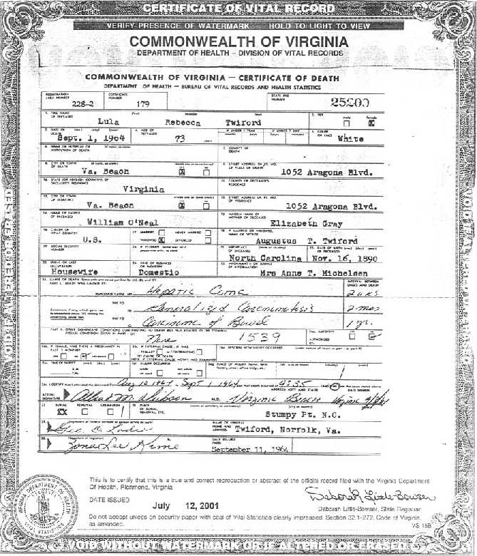 O'Neal in Stumpy Point on Oct. 14, 1906. Lula was born in Stumpy